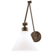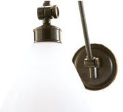 Articulated arms and metal construction are a few of the lasting innovations the industrial era bequeathed us. Exeter illuminates according to your need, using these same principles. At three points from backplate to shade, you can adjust Exeter along an axis perpendicular to the wall to direct its light where you want it. The backplate’s pivot allows you to move the arm to the left or right. Available with either a metal shade consistent in finish with the rest of the piece or a glossy white opal diffuser, Exeter makes for both a useful task light and a beautiful accent light.