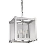Suspended in a glass cube, exposed-filament bulbs dance in a carousel of nickel, bronze, or brass. Machined edges and pinned corner-sleeves add handsome details to the piece. Its metal frame allows for a dramatic splash of shadow.