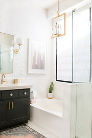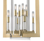 A brilliant mix of materials, Wellington’s sleek planes evoke a modernist sense of glamour. Cast metals mingled with gleaming acrylics to sophisticated effect. Our devotion to design unity shows in detailed candle sleeves, topping the mixed material motif with exposed-filament incandescent bulbs.