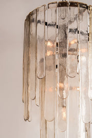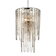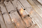 The trial-and-error nature of our creative process here made Fenwater a delightful discovery where the end product exceeded its initial design. Here’s how it works: our artisans hand pour molten glass into molds of three different lengths. By design, the glass is rough and champagne-hued to suggest a degree of antiquity. The hooked glass panels hang in a three-layered cascade in staggered lengths. The resulting appearance is at once warm and woozy, watery and icy.