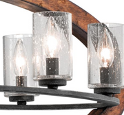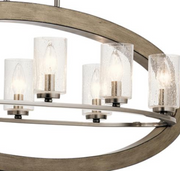 This distinctive 8 light chandelier from the Grand Bank collection creates a bold statement. The rich, Auburn Stained / Distressed Antique Gray finish and Clear Seedy Glass will accent any space in your home.