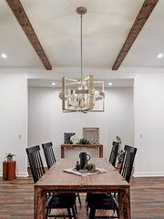 The popular industrial-inspired cage look gets a refreshing update with the Peyton collection 5 light chandelier. Squared edges and lines, in a blend of whitewashed wood tones as well as polished and satin nickel metals, create a style that’s soft and modern.