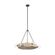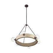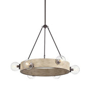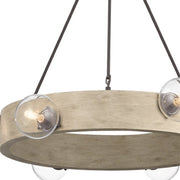 This 6 light chandelier from the Marquee collection brings a contemporary spin to a farmhouse staple, mixing clean, simple lines with a smooth wood-tone finish. Clear globes add a polished finishing touch to the look.