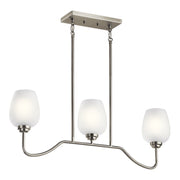 Inspired by the elegant and sleek design of a wine goblet, the 3-light linear chandelier from the Valserrano™ collection conveys grace and beauty with its sweeping finishes and Satin Etched glass. The Valserrano™ linear chandelier pairs traditional elements with a simple design to create a clean, classic look.