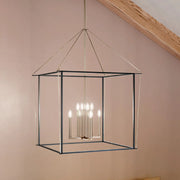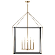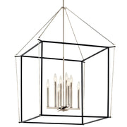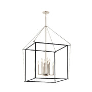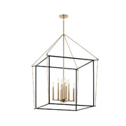 The Eisley foyer pendant's open-framed body design illuminates in a minimalist, modern aesthetic. Its contrasting mixed finish shapes are connected ever-so-slightly with a hook and eye at each corner of the cage. This foyer pendant is constructed without glass, giving the illusion that the fixture is floating.