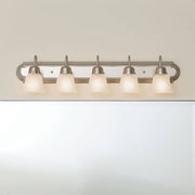 The modern lines of this 36" 5-light bath light fixture in a Chrome and Brushed Nickel finish with Satin Etched glass will blend into many decors.