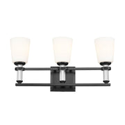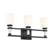 The Rosalind 3 light vanity light in black is true refinement. Satin etched cased opal glass and glamorous crystal candle sleeves give you the perfect bathroom glow. Mounted upright, Rosalind seamlessly blends with your modern or updated traditional decor.