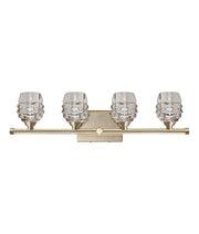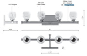 Vintage but modern LED four light vanity, spaced across an architecturally designed horizontal cylinder are elegant cannikins which omit the light beautifully through billowing heavy gauged die-cast clear glass.