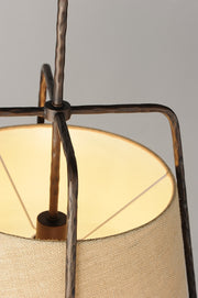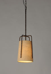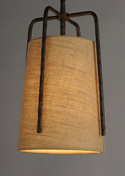 Rustic pendants of hammered iron finished in Oil Rubbed Bronze embraces a shade of Burlap fabric to create a casually comfortable appeal.