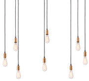 Cords of Black fabric support metal sockets finished in a natural Antique Brass allow you to create unique and fun lighting. All except the single pendant are supplied with hangers that attach to the ceiling to allow you to swag each socket. There are a number of optional bulbs to choose from.