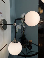 A Mid-Century Modern industrial classic revived featuring softly bent arms finished in Black with Polished Nickel accents that terminate at round White opal glass balls.