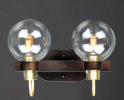 This classic Mid Century Modern design features a frame finished in a combination of Bronze and Satin Brass. The arms terminate at rings that support Clear heavy blown glass shades which were prevalent in this era.