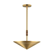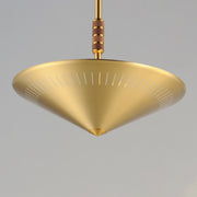 A retro re-imagining of perforated brass shades, this collection is inspired by Scandanavian Mid-Century Modern design. The conical forms feature cut outs along the edge of the shade allowing light to illuminate downward in a spectacular lighting effect. On the ceiling suspended lights, the lighting is cast mostly upwards providing ambient light that washes the ceiling in light.