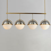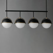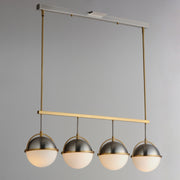 Tasteful globes constructed of metal and glass halves are combined and suspended by an arc-shaped yoke structure. The top dome of robust steel support lower halves of Satin White glass shades that twist lock on for convenience of installation and maintenance. This attractive design is sure to enhance your projects most needed spaces with an enduring appeal to the design that works in a variety of aesthetics.