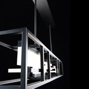 Using an intricate welding process, artisans smooth out the transitional seams of this Bauhaus-inspired design, giving it a clean look overall, then coating it with an enduring black finish. Behind the steel bars, sleek opalescent rectangles are illuminated by edge-lit LED modules carefully positioned to give the appearance of floating within, creating an unforgettable stark contrast of black and white.