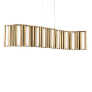 A contemporized mid-century inspired luminaire featuring geometric aged brass finished cylinders. This innovative design set in a wave suggests movement when viewed from various angles for a gracious statement over a long table or as room dividers when displayed in multiples at upscale establishments.