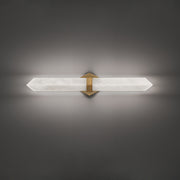 Light interaction. Lit from behind by hidden LEDs, an arrow of Spanish Alabaster embraced by a metallic band creates a luminous glow from natural veining and patterning inherent to this lovely stone.