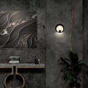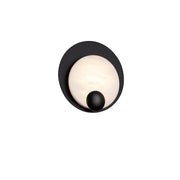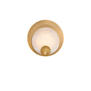 Alluring alabaster pairs with the intrigue of bold tones to mesmerize. Soft illumination highlights the nuances of the stone and casts warm reflections from the circular plates, creating an artful visual.
