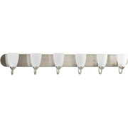 Gather possesses a smart simplicity to complement today's home. This six-light bath bracket contains etched glass shades which add distinction and provide pleasing illumination to your room.