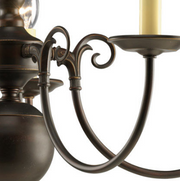 Five-light chandelier in the timeless Americana collection with delicate arms, decorative center column.