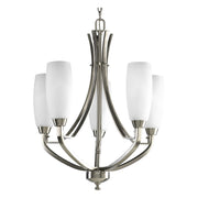 Five-light chandelier is characterized by its unique tulip-shaped glass shades and bold, sculptural design.