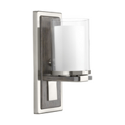 Mast has a zen-like modernism that blends the warmth of a faux-finish wooden backplate with a clean, modern pediment supporting a double-glass diffuser. The combination of clear and etched glass recreates the appearance of a votive candleholder to enhance the calming influence of this distinctive style.