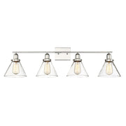 This Savoy House Drake 4-light bath bar has an alluringly simple style with a few choice hardware details and shades of clear glass.
