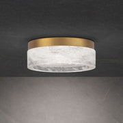 A modern round form with an artistic shade of Schonbek optic haze crystal. A soft welcoming glow emanates from high quality LEDs through crystal. This lovely ceiling mount is projected with a two-step hardware configuration.