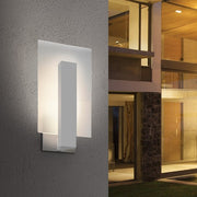 The classic modern elegance of straightforward geometry sets a frosted glass rectangle against a crisp rectangular beam, radiating the glow of its LED illumination.