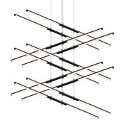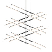 LED rods are suspended in tandem pairs on multiple levels, perpendicular to each other. Each rod can be independently positioned as up or down light, and adjusted with infinite variability to any height along the suspension cables. Dramatic in the precision of their orientation and range of verticality, Tik-Tak brings a crisp presence to the volume of space.