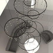 Suspended one below another in slightly offset arrangements these Power Bar rings form a configuration of vertical volume. Suspended around the circumference of each ring are alternate lengths of Ladder Lights Luminaires which fill the vertical voids with dazzling arrays of sparkling LED illuminated acrylic crystals.