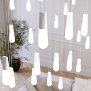 The Suspenders Parallels configuration features soft Etched Teardrop luminaires. The hanging height of each luminaire is adjustable, allowing for customizability for your project. This Suspenders configuration is available in a black or white finish. This configuration can be hung as a single chandelier, or scaled for larger spaces, making it ideal for residential, hospitality, or commercial environments.