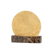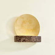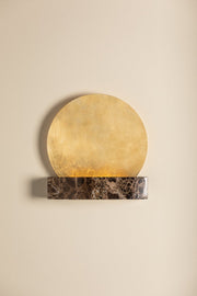 Ancient meets innovative in the captivating Rune. Resembling the moon, this sconce features a metal disc backplate that dips into a platform of honed Grey Emperador Marble, creating a striking contrast.
