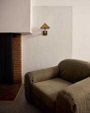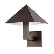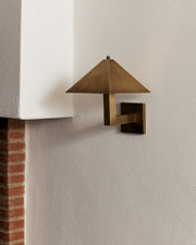A pyramid-shaped metal shade rests atop a thick square arm that extends into a square backplate, giving Knight a modern industrial aesthetic. A small, circular finial brings a touch of softness to this stately sconce.