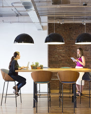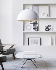 - High-end spun metal pendant that features a high-gloss finish